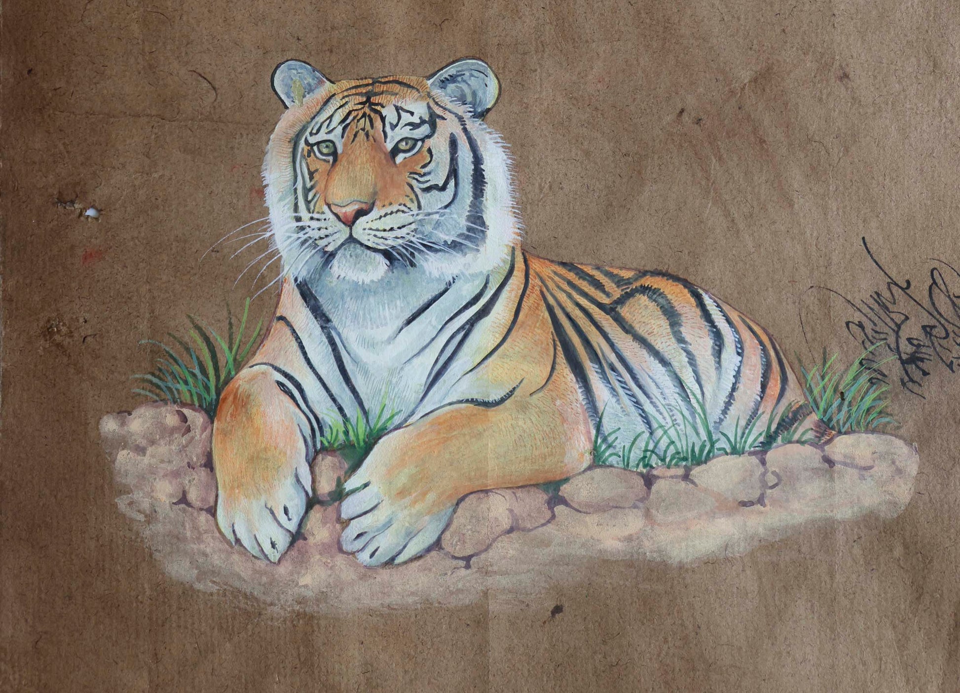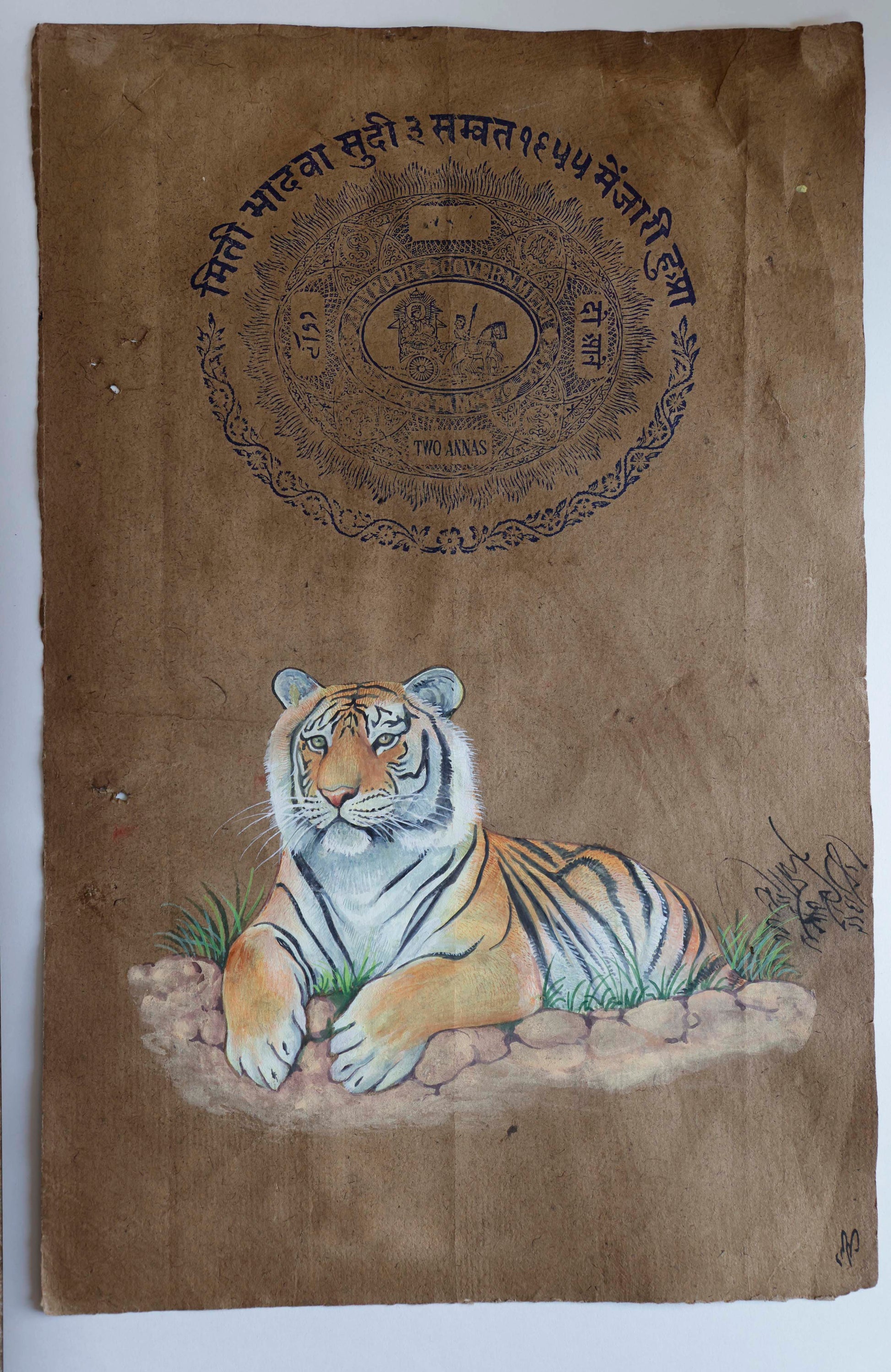 P8 Lying Tiger This exquisite miniature painting is created using natural gemstone pigments, applied with fine brushes made from squirrel tail hair. Meticulously rendered on authentic vintage court-stamped paper, each piece reflects timeless craftsmanship and historical elegance.