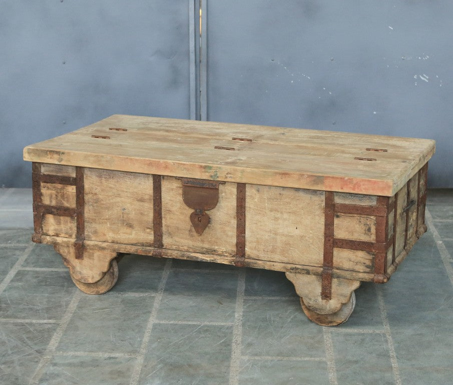 PA24981 - This antique Indian hand-carved wooden box, metal bound and mounted on wheels, crafted from teak wood, showcases exquisite craftsmanship and timeless design, making it both a functional and decorative piece for any space.