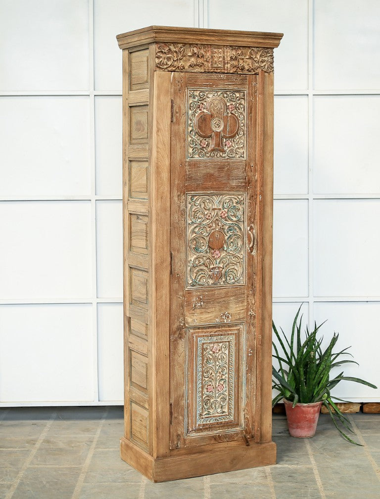 PA24917 - This vintage Indian superbly hand-carved one-door cabinet, made from teak wood, features intricate detailing and a stunning design, making it a timeless and elegant addition to any home.