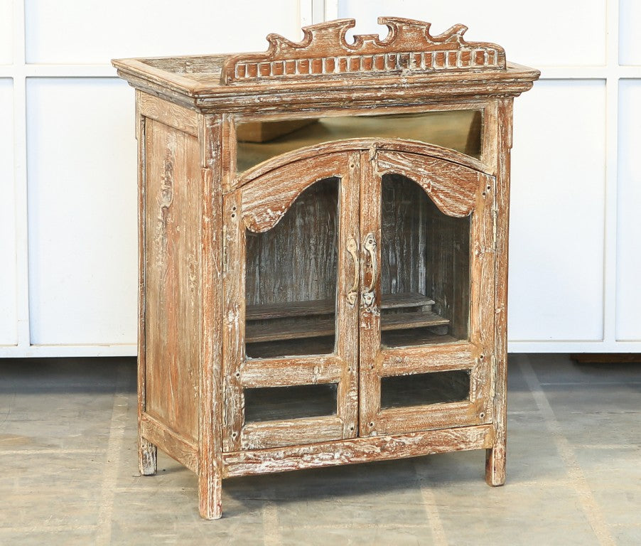 PA25151 - A vintage Indian cabinet, expertly crafted from rich teak wood and featuring a stunning glass-fronted design with two intricately carved doors, serves as both a functional storage piece and a beautiful work of art, bringing a touch of timeless elegance and cultural richness to any room.