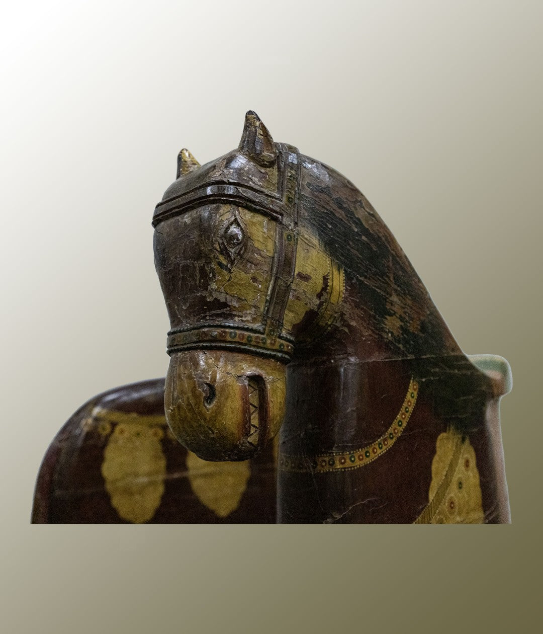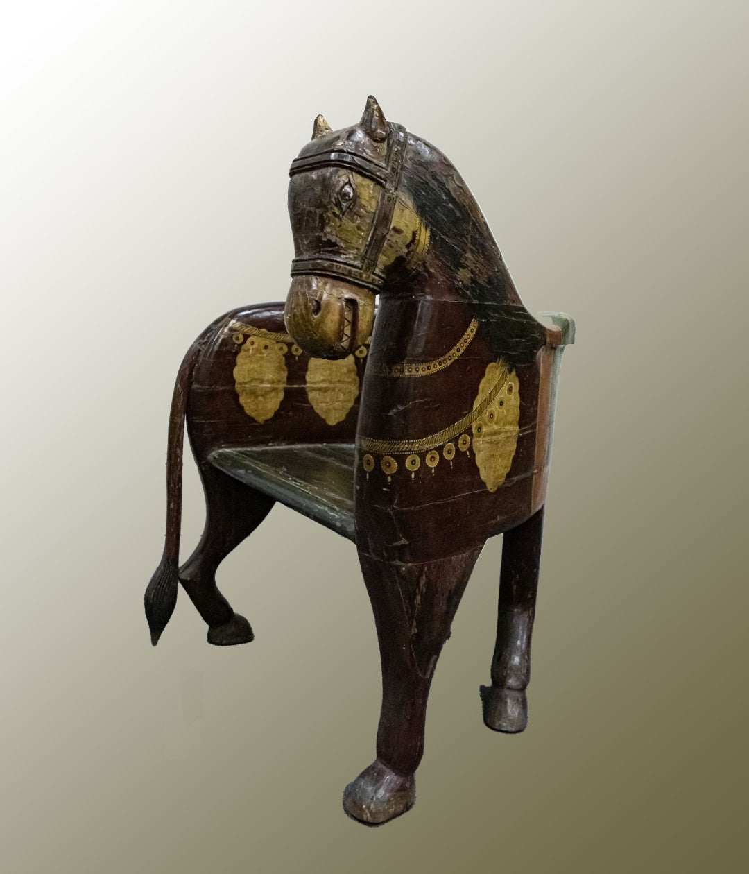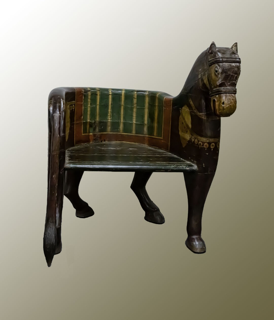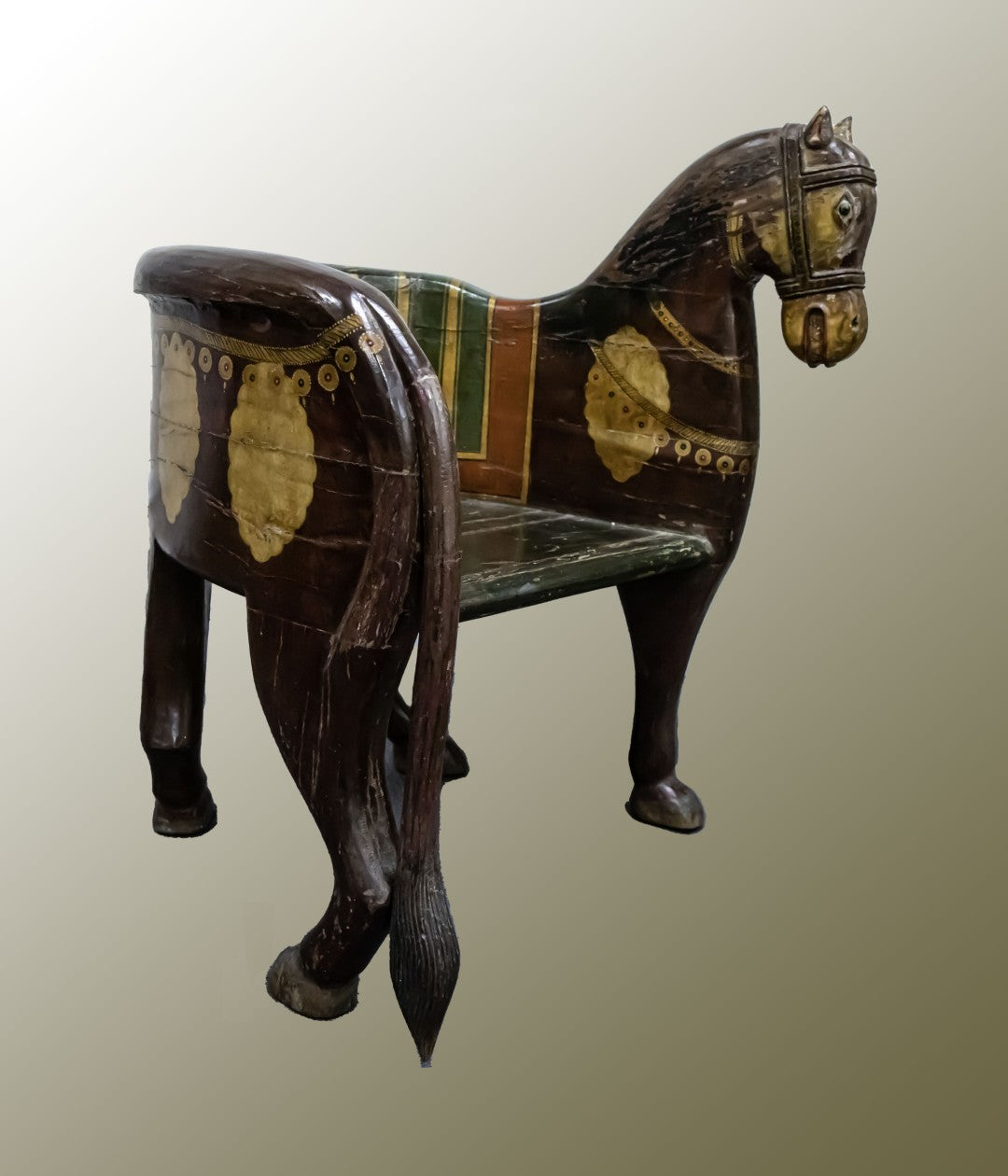 Wooden Painted Horse Chair. PA16425 - Bring a touch of whimsical charm and elegance to your home with this beautifully crafted Wooden Painted Horse Chair. A unique blend of artistry and functionality, this chair features an intricately hand-painted horse design that brings a sense of playfulness and grace to any room. The vibrant colours and detailed patterns give the chair a timeless, yet distinctive look that will stand out in both traditional and contemporary spaces. Made from sturdy, high-quality wood, this chair is as durable as it is beautiful, offering both comfort and style. The hand-painted finish showcases expert craftsmanship, with every curve and stroke highlighting the majestic horse motif, turning an everyday piece of furniture into a captivating work of art. A rustic-inspired living space, or as an accent piece in any room, this Wooden Painted Horse Chair offers a playful touch of elegance while providing a comfortable seat. A truly functional piece with a dash of personality, it will add a sense of wonder and beauty to your home for years to come. It's approximately 10 - 15 years old.